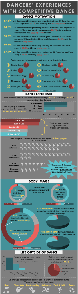 I also have experience making info-graphics to help communicate results to non-academic audiences. The examples below are from a study on motivations for being involved in dance.